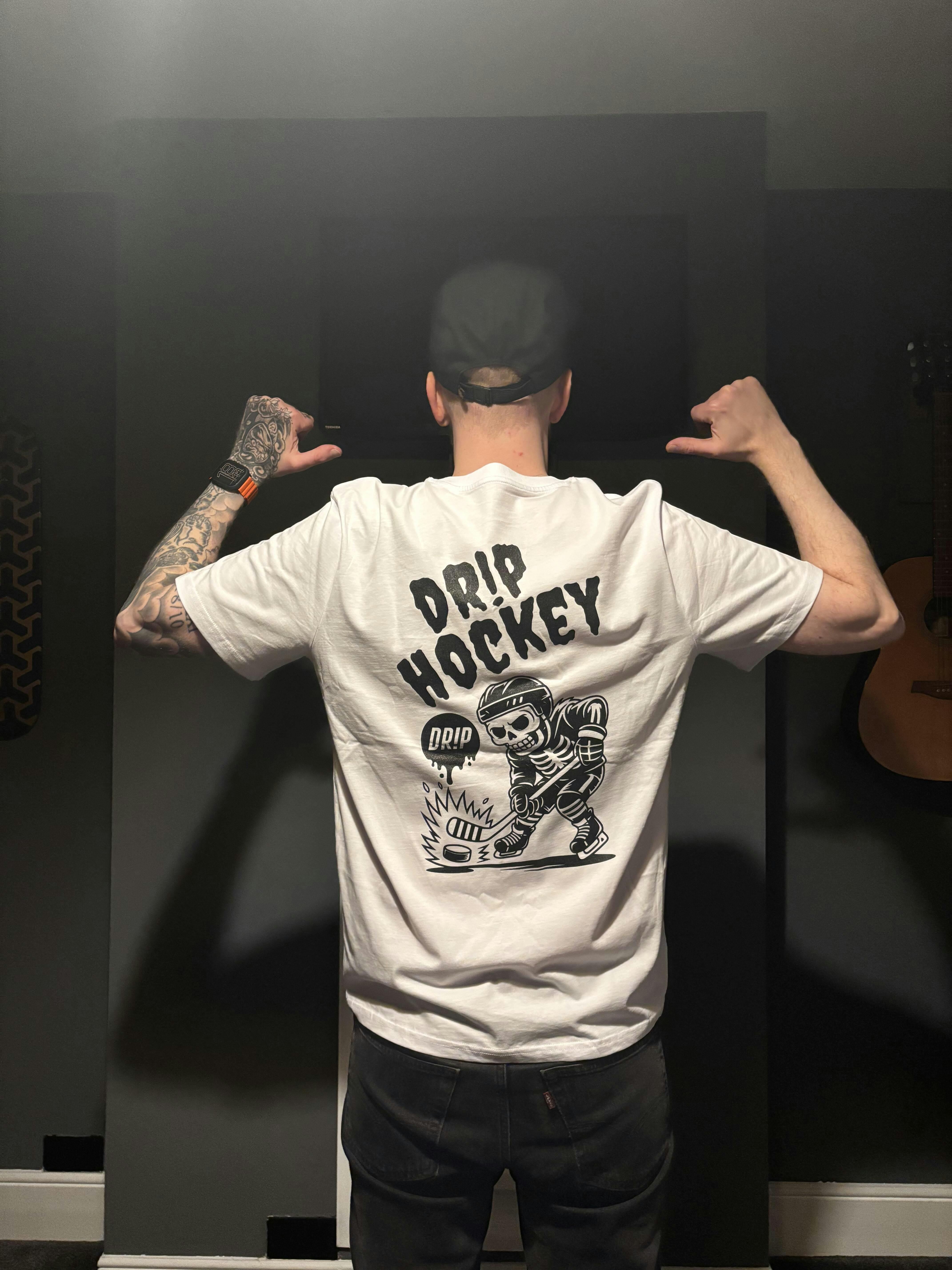 This premium white tee features a bold, eye-catching graphic on the back: a full skeleton player decked out in hockey gear, stickhandling a puck that's practically on fire. The "DRIP HOCKEY" text floats above in a hard-hitting, dripping font. To complete the look, a clean, circular "DR!P PUCK" logo sits on the front left chest.